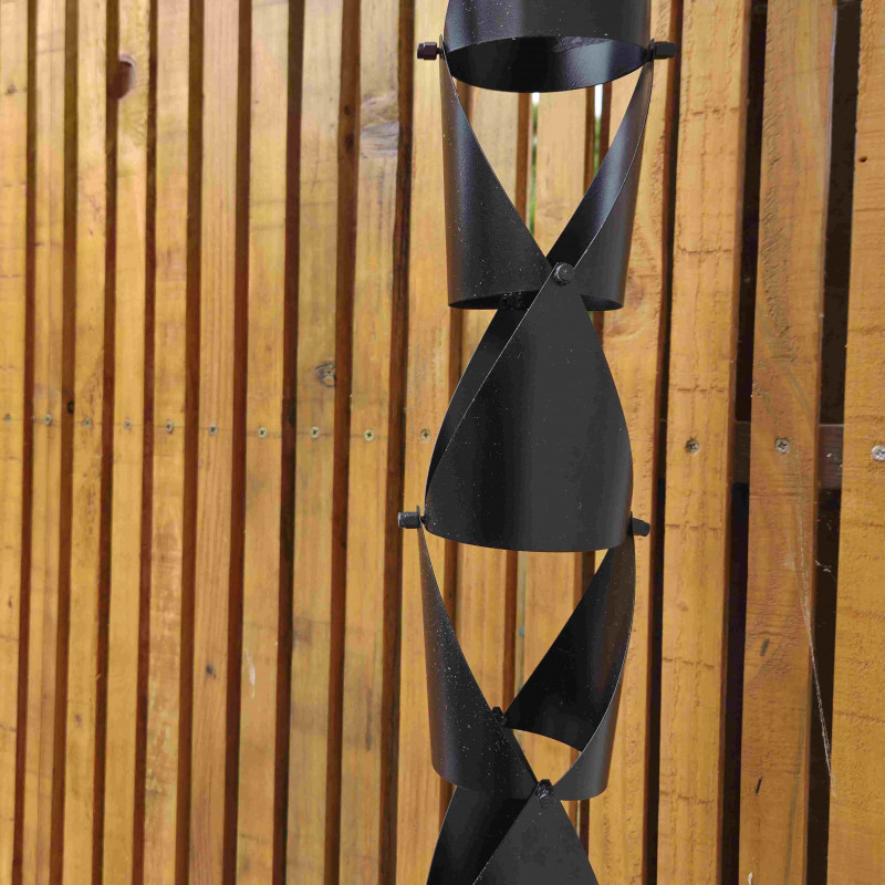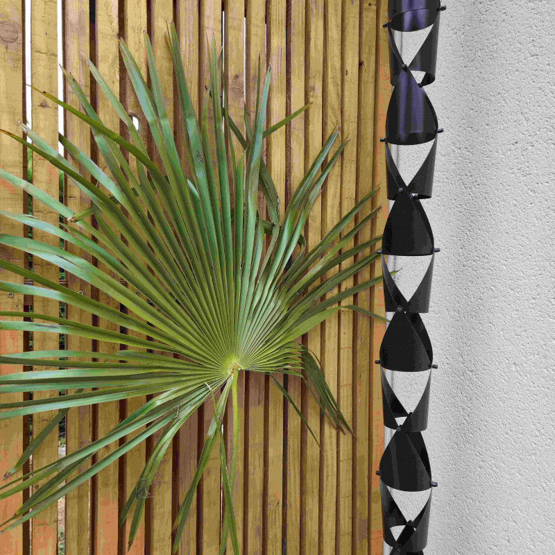 - S'adapte sur toutes les gouttières, un crochet est fourni à poser au fond de votre gouttière, pas besoin de modifier quoi que ce soit, juste de déboiter votre tube de descente de gouttière en pvc ou autre et de le remplacer par votre chaine de pluie.
