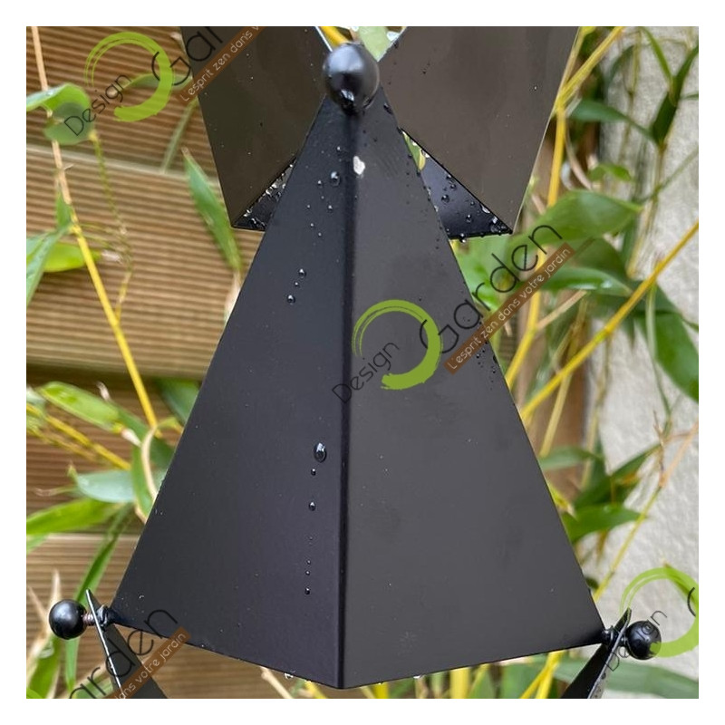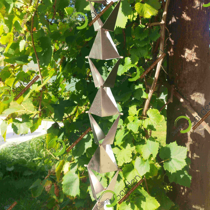 - S'adapte sur toutes les gouttières, un crochet est fourni à poser au fond de votre gouttière, pas besoin de modifier quoi que ce soit, juste de déboiter votre tube de descente de gouttière en pvc ou autre et de le remplacer par votre chaine de pluie.