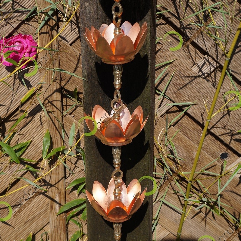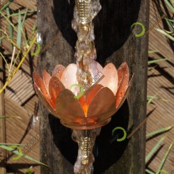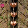 La chaîne de pluie Lotus comprend des coupelles en cuivres apparentées à des fleurs de lotus doubles imbriquées, ouvertes chacune en bas pour guider l'eau vers le sol. Cette descente de gouttière design et originale vous séduira et trouvera sans aucun doute sa place dans vos jardins.
